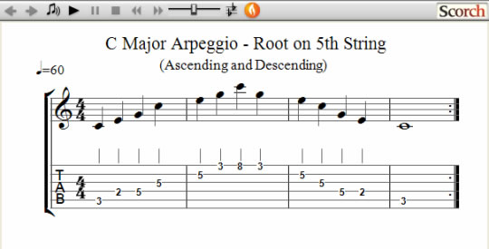 The C Major arpeggio notes are C-E-G as shown below with the Root (C) starting on the 5th string.
