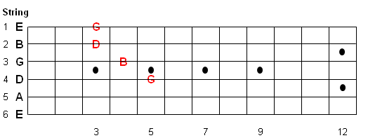 The G Major arpeggio notes are G-B-D as shown below with the Root (G) starting on the 4th string.