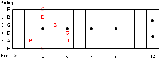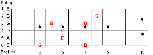 The G Major arpeggio notes are G-B-D as shown below with the Root (G) starting on the 6th string.