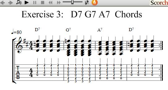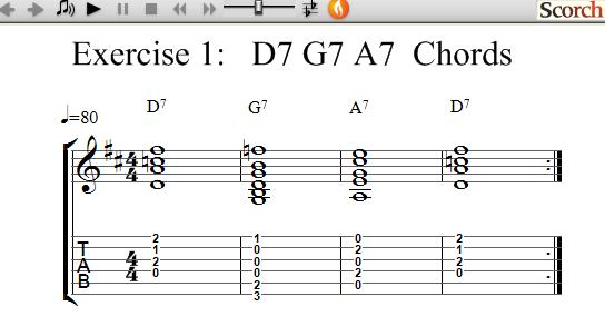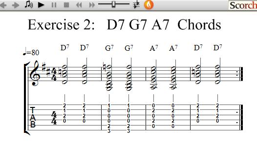 This exercise uses the D7, G7 and A7 chords which are each shown separately for you. Once you know how to play each chord try the exercises to get use to changing between chords and learning how to get the timing with your right hand by strumming as shown.
