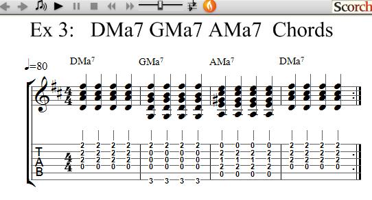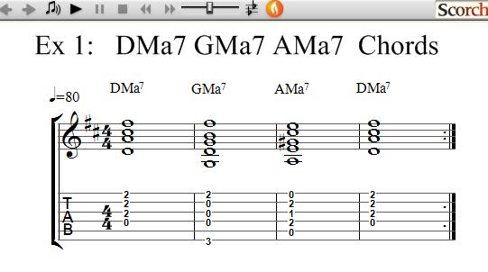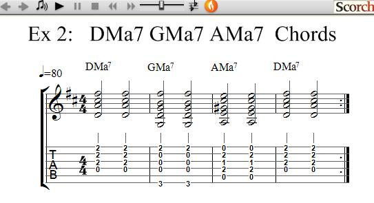 This exercise uses the DMa7, GMa7 and AMa7 chords, which are each shown separately for you. Once you know how to play each chord try the exercises to get use to changing between chords and learning how to get the timing with your right hand by strumming as shown.