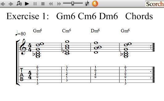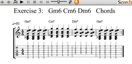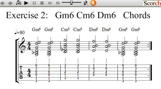 The following exercises use 3 Minor Six chords each and show how to practice learning and changing between chords.