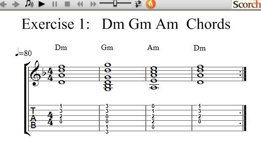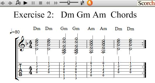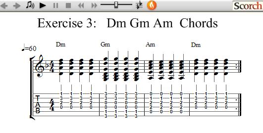 The following exercises use 3 Minor chords each and show how to practice learning and changing between chords.