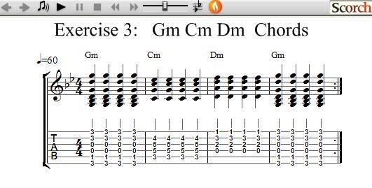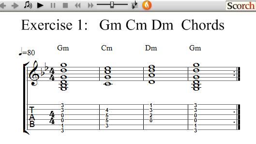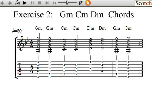 This exercise uses the Gm, Cm and Dm chords which are each shown separately for you. Once you know how to play each chord try the exercises to get use to changing between chords and learning how to get the timing with your right hand by strumming as shown.