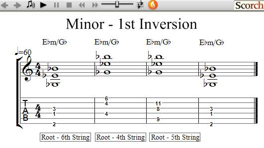A Triad is a 3 note chord and is essentially the smallest chord. A Minor Triad is based on the 1st (Root) - b3rd & 5th notes of a major scale. Inversions change the order of the notes by playing a different note as the lowest note of the chord. The chord symbols are written using a slash (/) such as Cm/Eb which means to play a C minor chord with the Eb note as the lowest note in the chord. These chord symbols are common to other instruments such as keyboards.