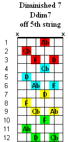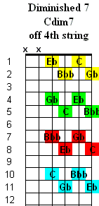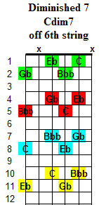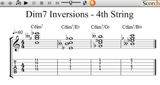 The dim7 chord is based on the 1st (Root) - b3rd - b5th & bb7th notes of a major scale. Inversions change the order of the notes by playing a different note as the lowest note of the chord. The chord symbols are written using a slash (/) such as Cdim7/Eb which means to play a Cdim7 chord with the Eb note as the lowest note in the chord. These chord symbols are common to other instruments such as keyboards.