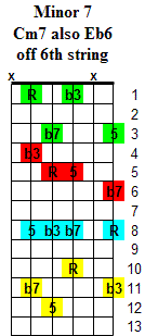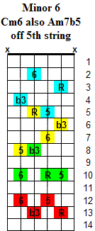 The Minor 6 chord is based on the 1st (Root) - b3rd - 5th & 6th notes of a major scale. Inversions change the order of the notes by playing a different note as the lowest note of the chord. The chord symbols are written using a slash (/) such as Cm6/Eb which means to play a Cm6 chord with the Eb note as the lowest note in the chord. These chord symbols are common to other instruments such as keyboards.