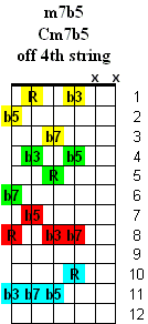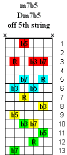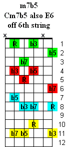 The m7b5 chord is based on the 1st (Root) - b3rd - b5th & b7th notes of a major scale. Inversions change the order of the notes by playing a different note as the lowest note of the chord. The chord symbols are written using a slash (/) such as Cm7b5/Eb which means to play a Cm7b5 chord with the Eb note as the lowest note in the chord. These chord symbols are common to other instruments such as keyboards.