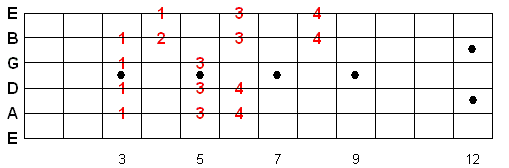 Once you memorize this fingering pattern you can reuse it by moving up or down the fretboard. Whatever note you start on is the 1st note of the scale.