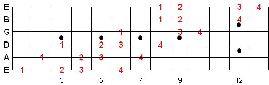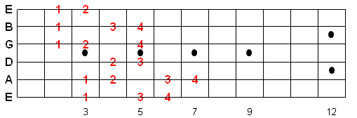 There are 3 types of scale fingering patterns shown below. The Caged system is the easiest pattern to learn and provides for a 2 octave range often in 1 hand position. All of the numbers in RED are the suggested fingerings. Once you memorize this fingering pattern you can reuse it by moving up or down the fretboard. Whatever note you start on is the 1st note of the scale.