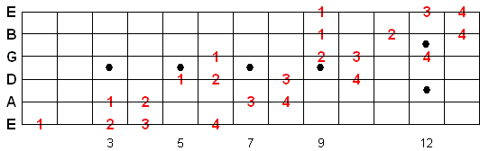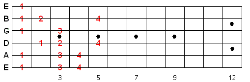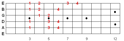 Once you memorize this fingering pattern you can reuse it by moving up or down the fretboard. Whatever note you start on is the 1st note of the scale.