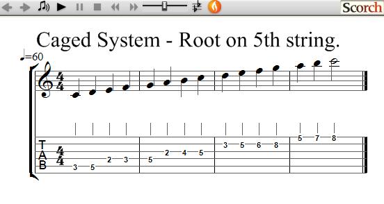 There are 3 types of scale fingering patterns shown below. The Caged system is the easiest pattern to learn and provides for a 2 octave range in 1 hand position. All of the numbers in RED are the suggested fingerings.