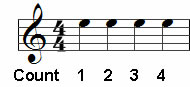 For this exercise we will only use Quarter Notes so you can focus on learning the notes on the Music and the Guitar Fretboard. Quarter notes receive 1 beat or 1 count each as shown in this single bar of music: