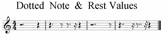 A DOT placed after a Note or Rest increases the length by one-half (1/2) of its Original value.