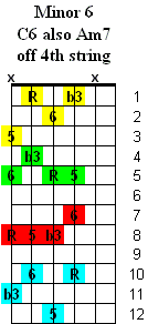 The Minor 6 chord is based on the 1st (Root) - b3rd - 5th & 6th notes of a major scale. Inversions change the order of the notes by playing a different note as the lowest note of the chord. The chord symbols are written using a slash (/) such as Cm6/Eb which means to play a Cm6 chord with the Eb note as the lowest note in the chord. These chord symbols are common to other instruments such as keyboards.